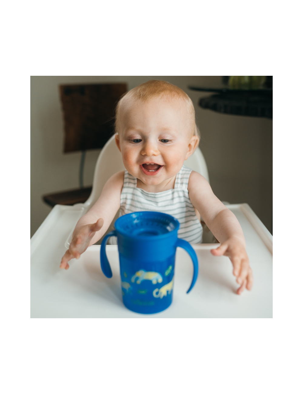 360-stopinjski lonček omogoča vašemu otroku, da pije s kateregakoli roba. Zaradi prozornega silikona lahko karakoli tudi pogleda v notranjost, brez da bi se tekočina med tem polila.