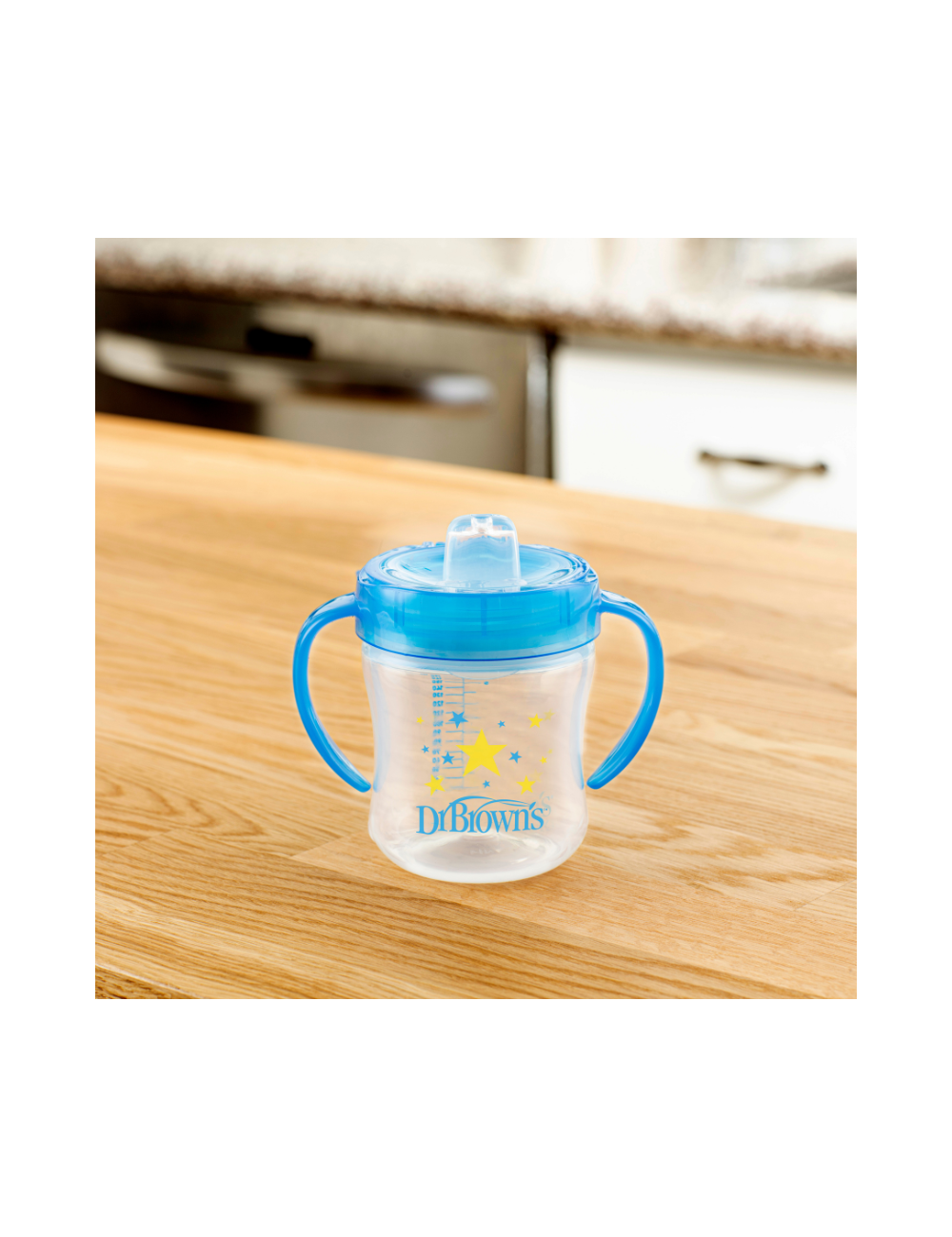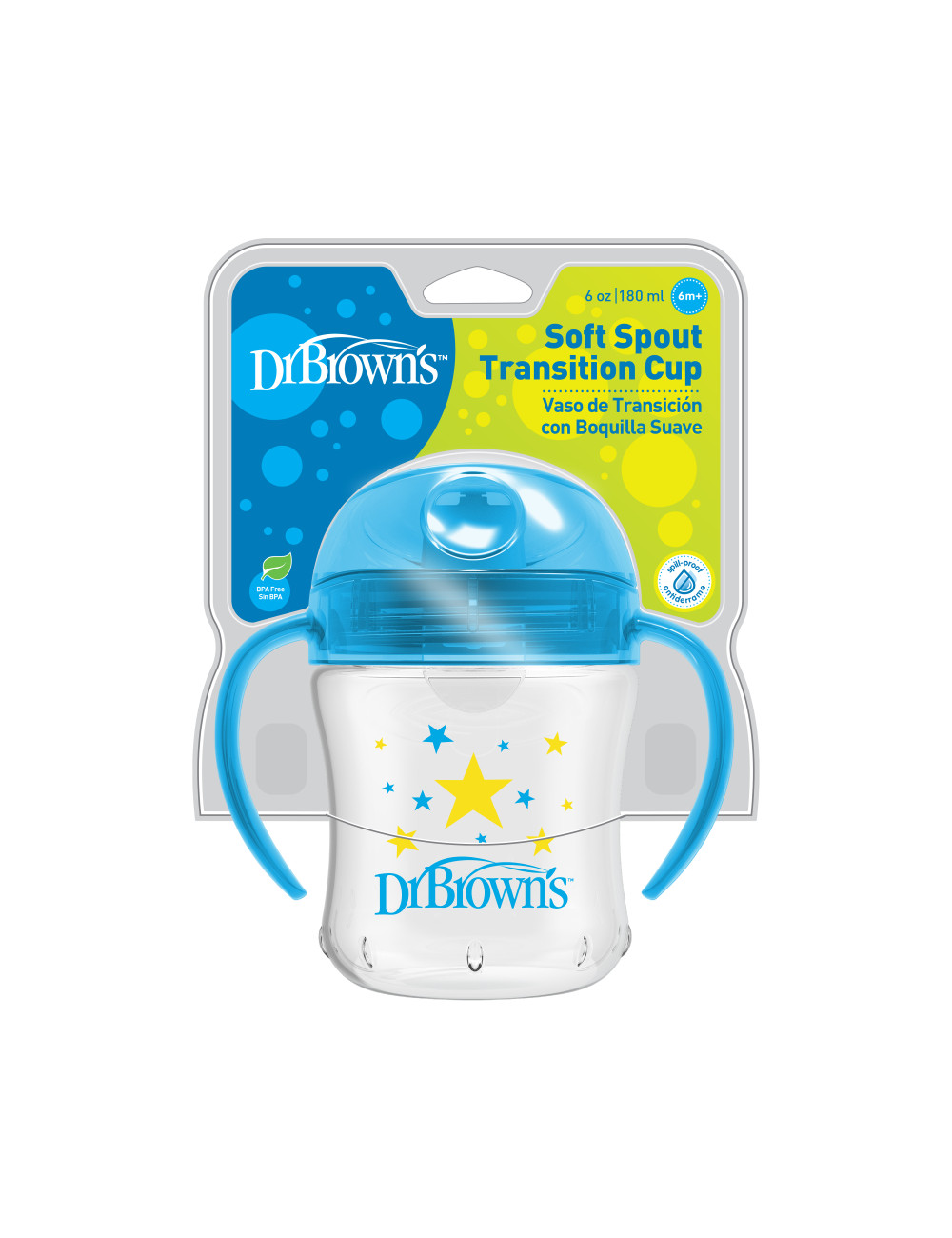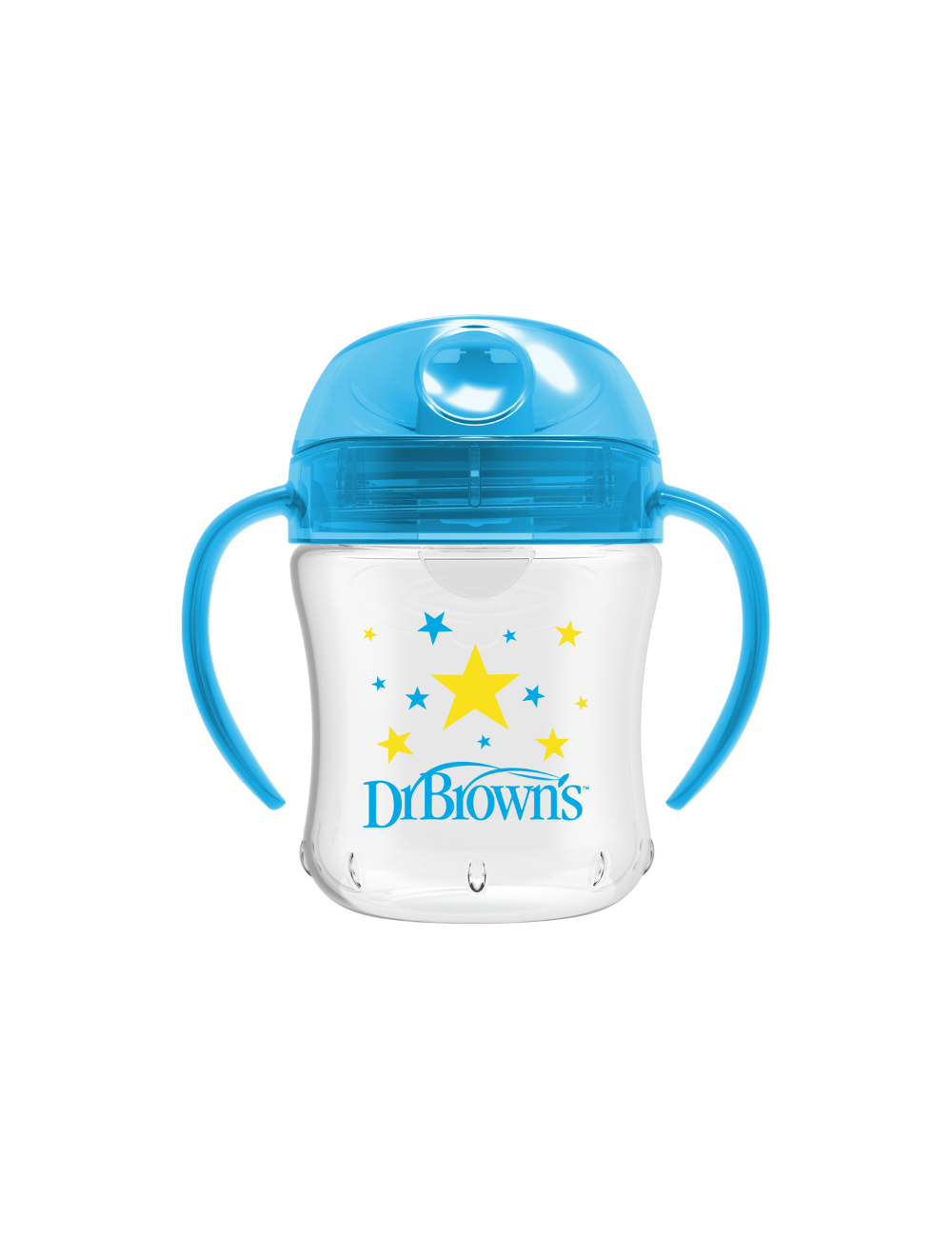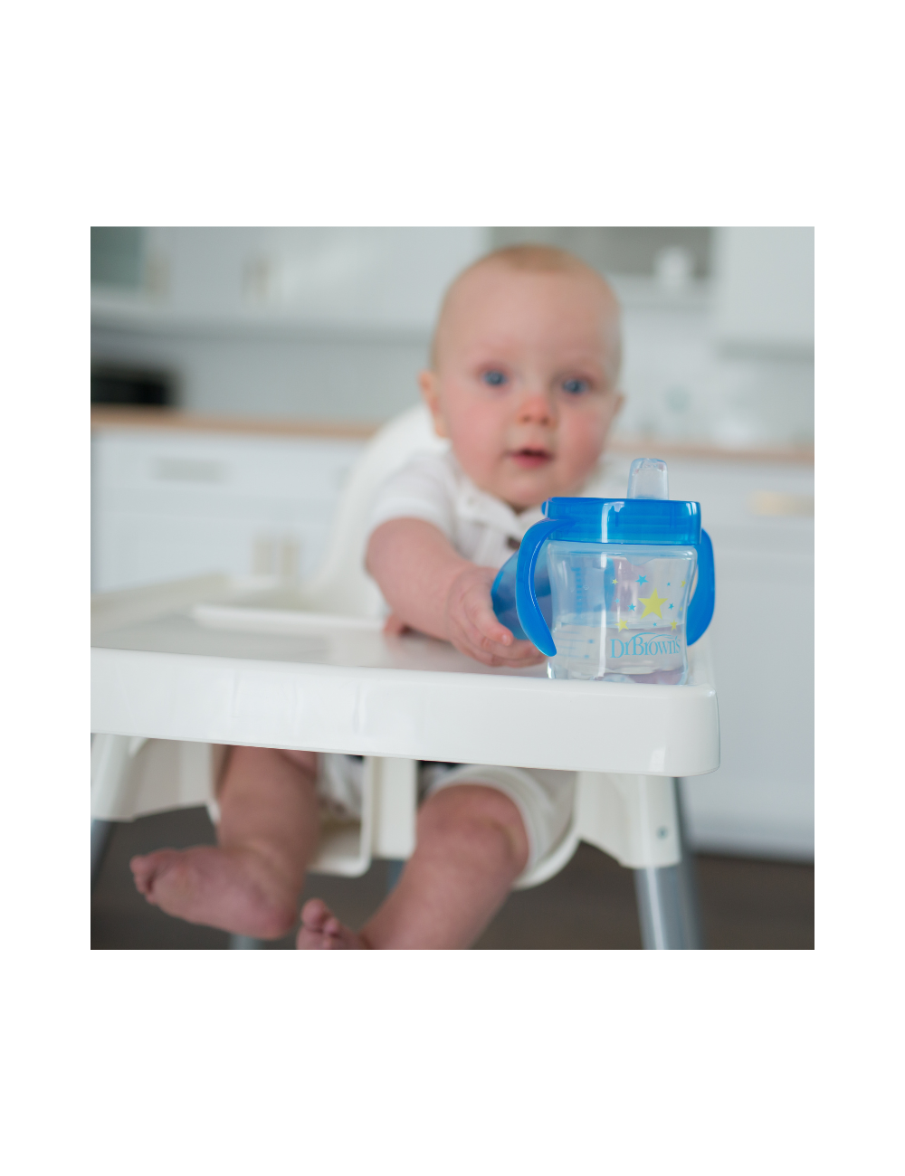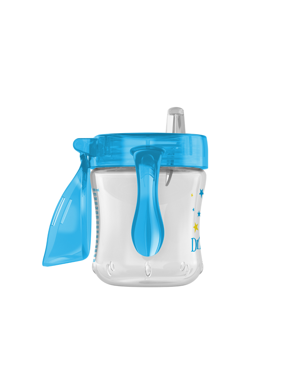 S postopnim uvajanjem na pitje. Z lončkom za učenje pitja Dr. Brown’s.