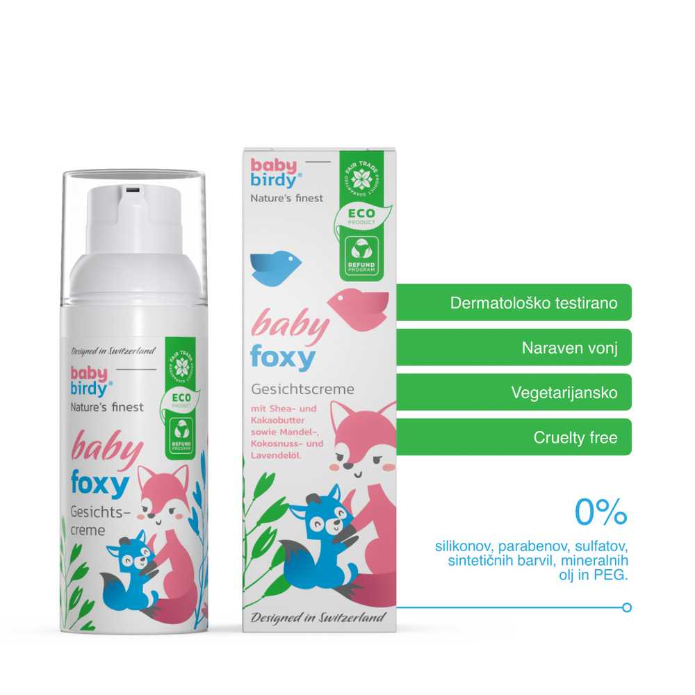 BabyFoxy je skrbno izbrana kombinacija povsem naravnih, dragocenih sestavin, kot so karitejevo maslo, ki uravnava vlago kože ter jo pomirja, kakovovo maslo, ki kožo oskrbuje z lipidi ter dragocena negovalna olja kokosa, mandlja in sivke. BabyFoxy bo poskrbel za koža vašega malčka nebeško mehka. Otroška krema zagotavlja dolgotrajno vlago in ohranja naravno zaščitno pregrado.