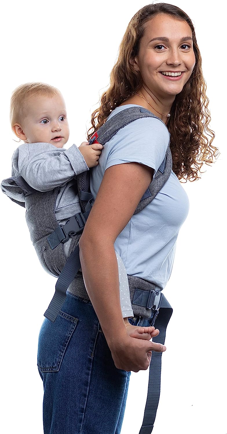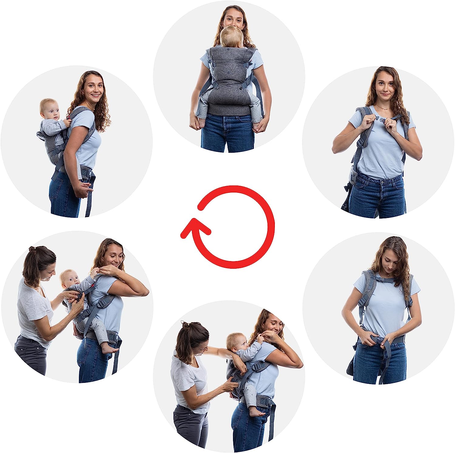 - 4 ergonomski načini nošenja dojenčka ali malčka: možnost nošenja zadaj in 2 možnosti nošenja spredaj za dojenčke in malčke; nošenje spredaj z otrokom, obrnjenim navzven, je priporočljivo od 6 mesecev naprej, nošenje zadaj s širokim sedežem pa je priporočljivo za otroke, stare 1-2 leti.
