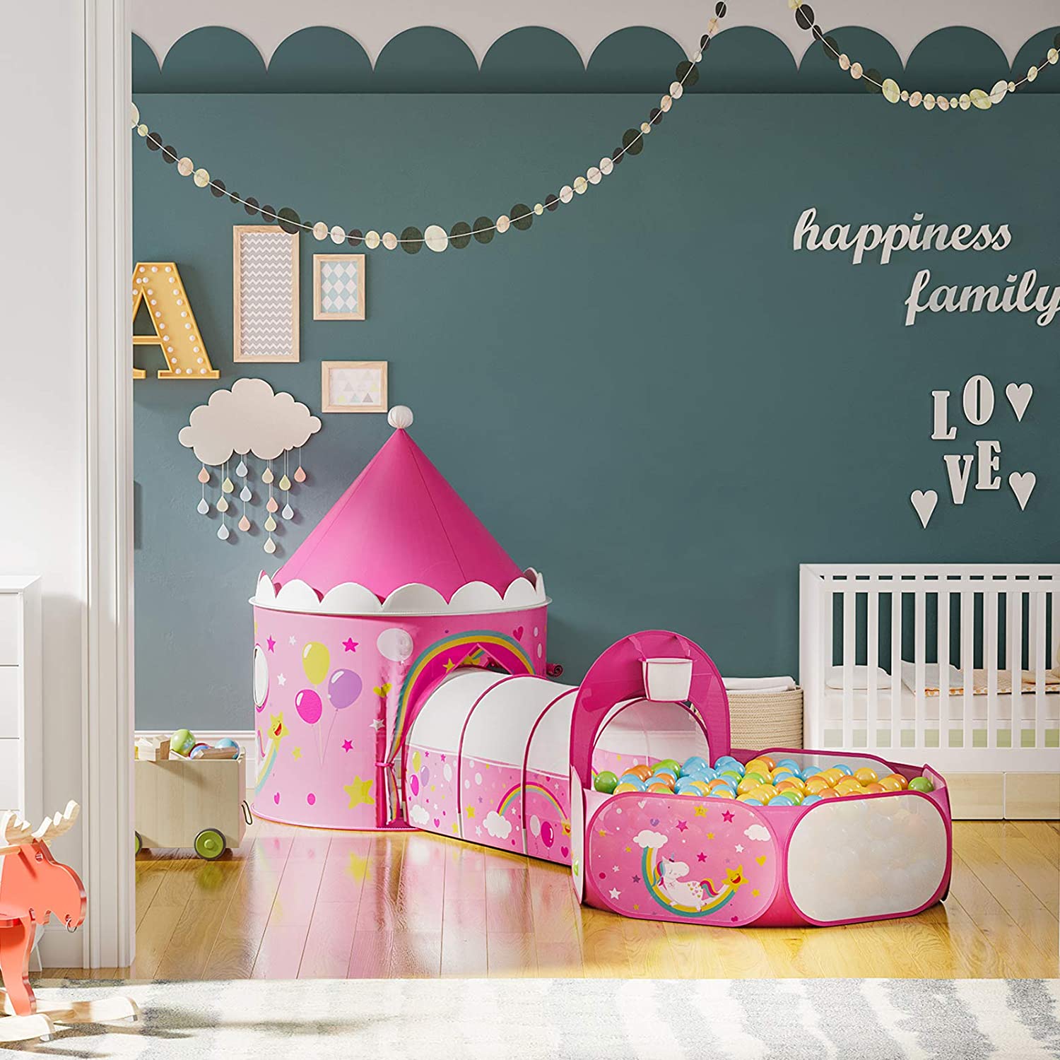 Mami, poglej si tole. Povsod po površini igralnega šotora se lesketajo mavrice, zvezdice, srčki in baloni. Rožnata barva je tako nežna in mehka, da se vanjo zaljubiš. Želim si to doma!