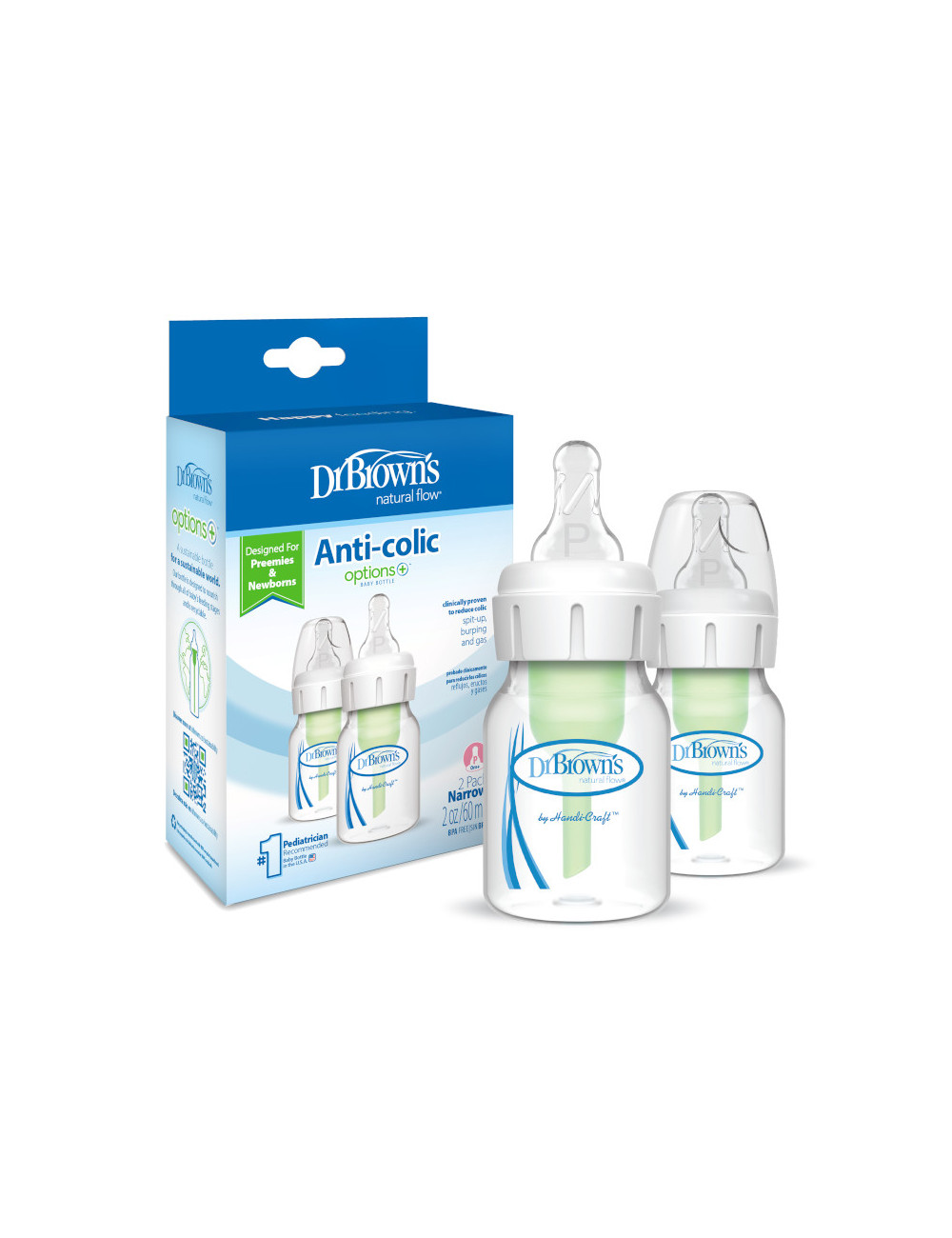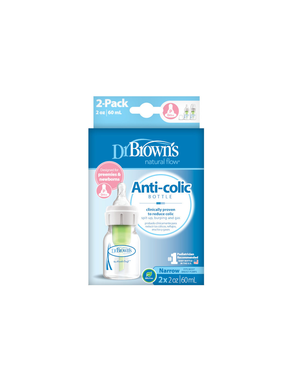 Dr. Brown’s Anti-Colic steklenička je oblikovana ravno za nedonošenčke. Majhna steklenička ima volumen 60 ml in ustreza cuclju za nedonošenčke, saj jim zagotavlja prilagojen počasen pretok. Primerna je tudi za dojenčke z drugimi izzivi pri hranjenju.